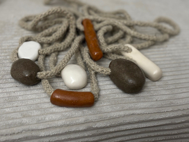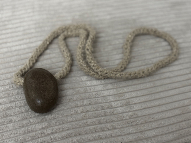 Verižica združuje dva elementa narave – glino in nit – v edinstven, sodoben kos nakita. Ročno oblikovan glineni »kamen« je ustvarjen kot droben fragment zemlje, z nežno teksturo in organsko obliko, ki ohranja toplino naravnega materiala. Skoznjega poteka ročno kvačkana špaga, ki element objame, preplete ali rahlo prekine, kar ustvarja subtilen dialog med trdnim in mehkim, med zemeljskim in osebnim.