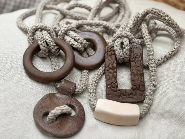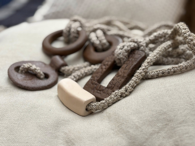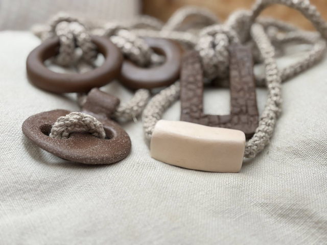 Ta edinstvena ogrlica združuje rustikalni čar naravnih materialov in sodoben estetski pristop. Ročno kvačkana vrvica iz špage daje kosu toplino, naravno strukturo in trajnost, medtem ko osrednji leseni obesek poskrbi za eleganten kontrast in umetniški pridih.